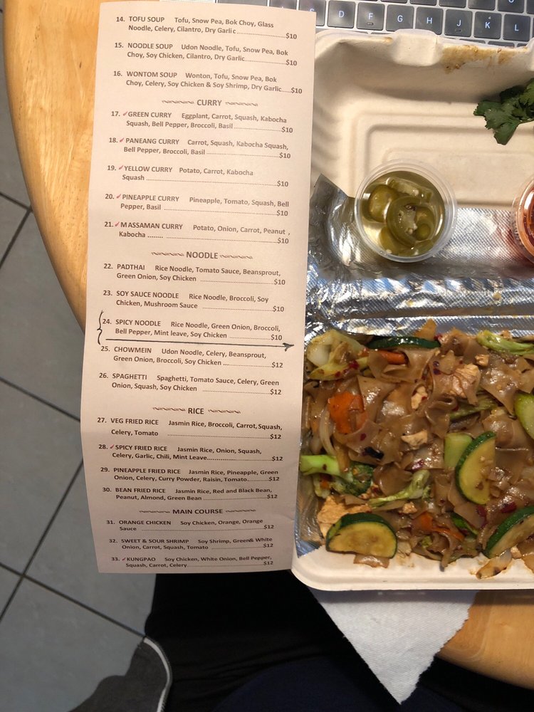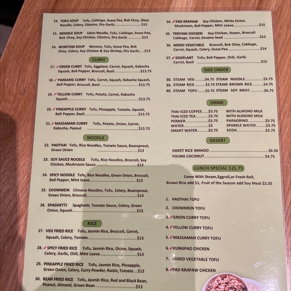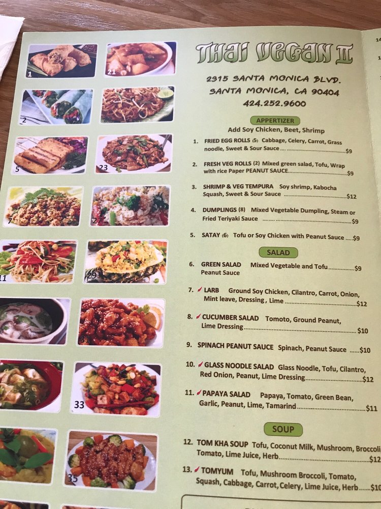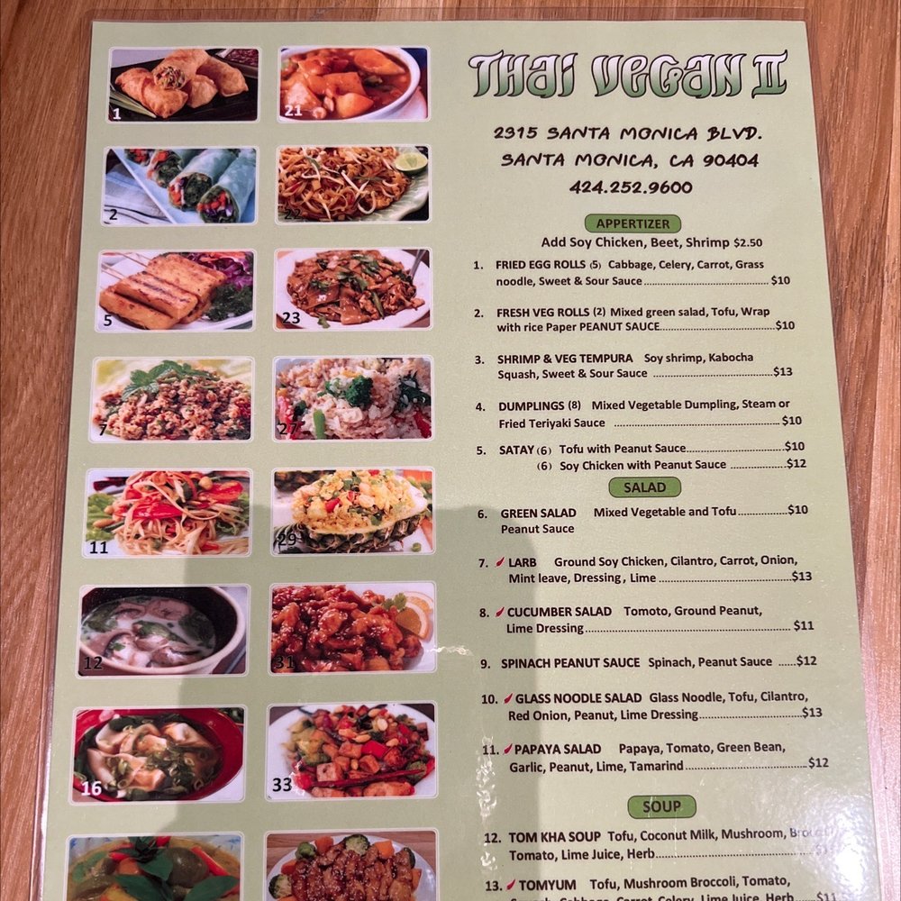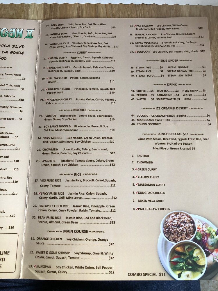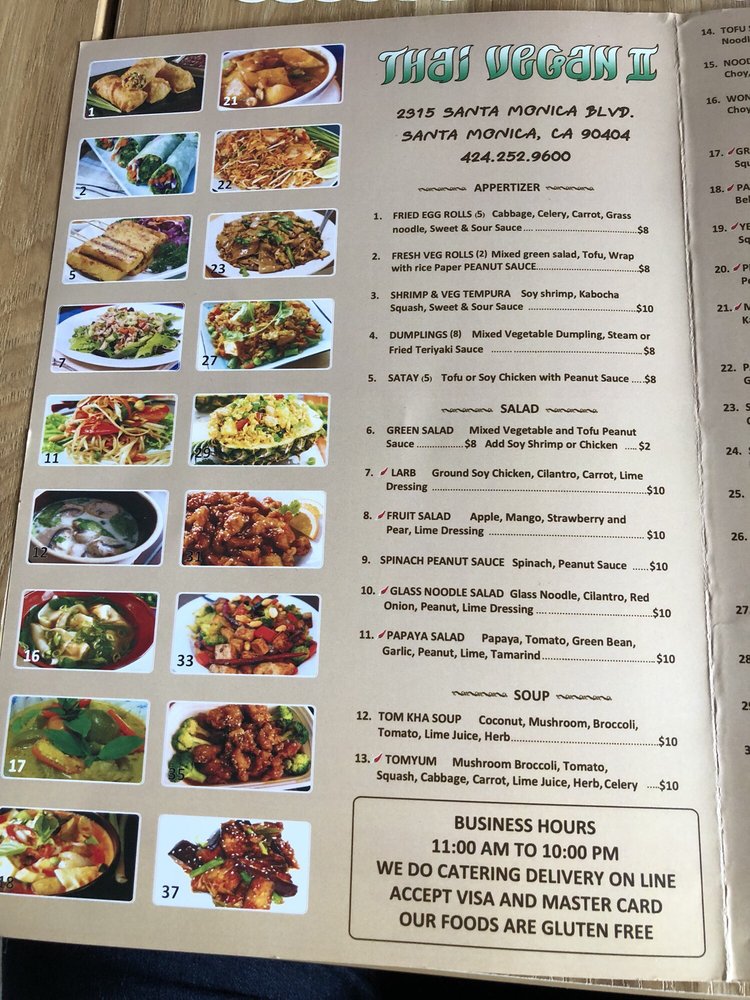Introducing the menu at Thai Vegan II - Santa Monica, where you can enjoy a variety of delicious vegan and vegetarian options. From appetizers like fried egg rolls and fresh vegetable rolls to soups like Tom Kha and Tom Yum, the menu is filled with flavorful choices. Salad options include Larb Salad and Glass Noodle Salad, all prepared with care and attention to detail. Customers rave about the friendly service and affordable prices, making it a go-to spot for Thai comfort food in the area. With dishes like Vegan Orange Chicken and Pad Thai receiving high praise for their flavor and generous portions, Thai Vegan II is a must-visit for those looking for healthy and tasty vegan options in Santa Monica.
